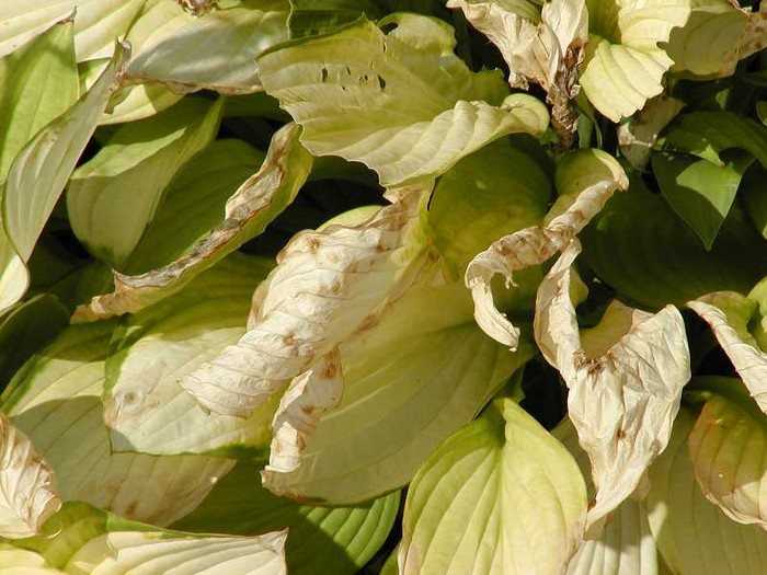 | Избыток солнечного света | Листья выгорают, становятся желтыми или белесыми, могут появляться ожоги. | Пересадка хосты в более затененное место или создание искусственного затенения. |