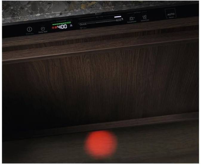 Звуковой сигнал присутствует в более простых вариантах. В конце цикла работы устройство подает звуковой сигнал. Луч света на полу позволяет понять, завершилась ли мойка, не открывая дверцу. Если процесс еще продолжается, луч светится красным. По окончании цикла он либо гаснет, либо меняет цвет.