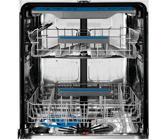 Полноразмерные посудомоечные машины обычно оборудованы 2-3 разбрызгивателями. Очевидно, что увеличение их количества позволяет сократить количество «слепых» зон, куда струи воды не могут добраться. Основным является нижний разбрызгиватель, который представляет собой симметричную вращающуюся лопасть с отверстиями на верхней части. Компания Электролюкс улучшила конструкцию своих моделей, добавив вращающийся диск в конце лопасти. Второй разбрызгиватель, который немного меньше первого, расположен под средней корзиной. А под потолком внутренней камеры находится мини-лопасть или форсунка. В компактных моделях обычно предусмотрены два разбрызгивателя.