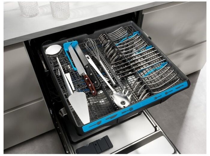 Верхняя корзина для приборов имеет мелкие ячейки, что предотвращает их падение.