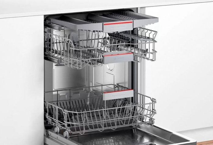 Стандартная классическая комплектация посудомоечной машины включает две основные корзины: нижнюю, предназначенную для крупной посуды, и верхнюю для мелких предметов, а также лоток для столовых приборов, который устанавливается в нижнюю корзину. Корзины удобно выдвигаются на направляющих, что облегчает процесс загрузки.