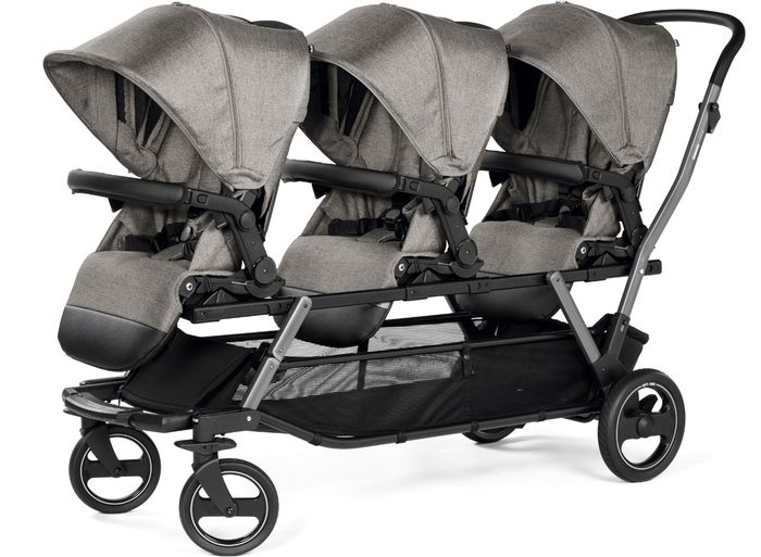 Коляска для тройняшек обеспечит комфорт как для малышей, так и для их родителей. Она отличается высокой проходимостью благодаря большим колесам, компактным размерам и легкости конструкции. Сиденья достаточно просторные, а спинки имеют три уровня регулировки. Максимально сиденья могут быть опущены до полугоризонтального положения. Козырьки достаточно большие и надежно защищают от ветра, дождя и солнечных лучей.