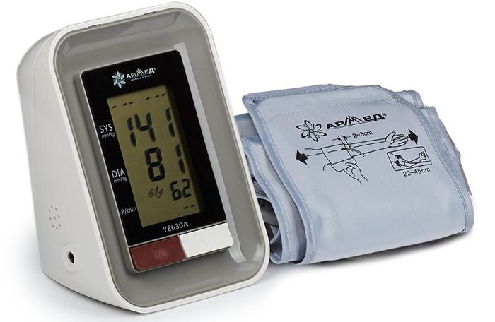 Армед YE-660B оснащен адаптером на 6В и 600мА (блок постоянного тока), что позволяет ему долгое время обходиться без батареек. Устройство имеет крупное и подсвеченное табло, что делает его удобным для людей с ослабленным зрением. Манжета, выполненная из прорезиненного материала, отличается высокой прочностью и надежностью. Звуковое сопровождение можно настроить в меню, выбрав один из режимов: отключение или максимальный уровень в 5.