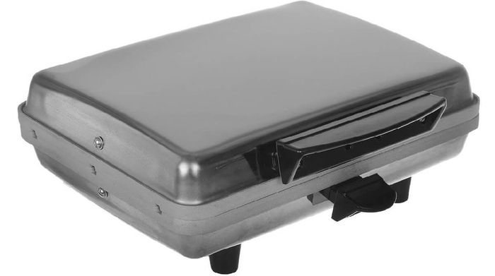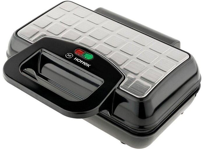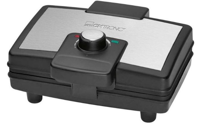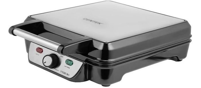 Эта большая электровафельница с мощностью 1100 Вт позволяет одновременно готовить четыре порции десерта прямоугольной формы. Корпус устройства выполнен в стильном серебристо-чёрном цвете, из прочного пластика с добавлением нержавеющей стали. На передней панели находится регулятор мощности, который дает возможность настраивать температурный режим рабочих поверхностей. Это позволяет готовить вафли с различной плотностью, используя разные рецепты. Верхняя крышка оснащена ручкой, которая не нагревается, а формы имеют антипригарное тефлоновое покрытие.