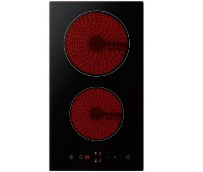 Это стеклокерамическая электрическая варочная поверхность. В центре устройства расположены две керамические конфорки, выполненные по принципу «Домино». Компактные размеры плиты позволяют эффективно использовать пространство на маленьких кухнях. Она оснащена такими функциями, как индикатор остаточного тепла, функция кратковременной паузы и система защитного отключения. Сенсорная панель управления Touch Slider находится на передней части устройства.