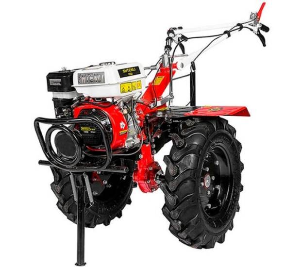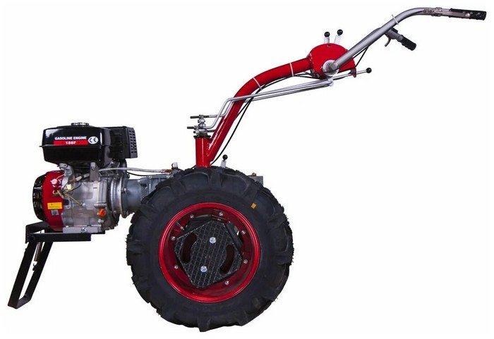 Применение различных навесных принадлежностей значительно расширяет функционал устройства. Улучшенная проходимость достигается благодаря большим резиновым колёсам с выраженным протектором, который обеспечивает отличное сцепление с грунтом. Металлические крылья на колёсах защищают оператора от брызг и грязи.