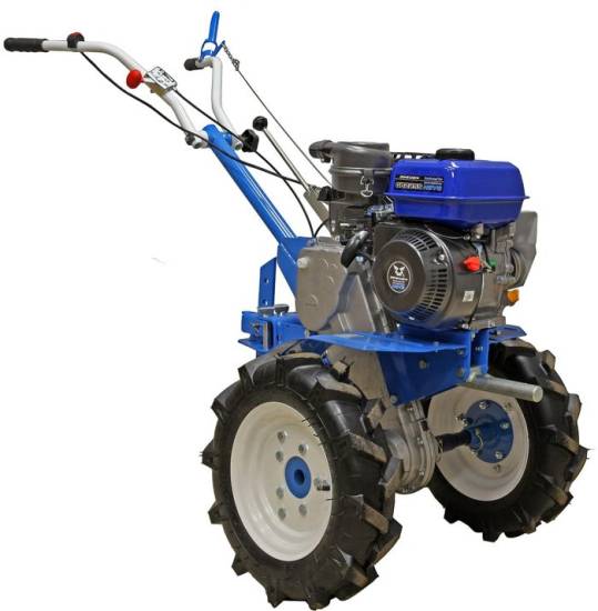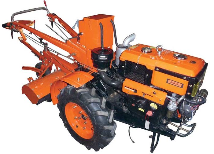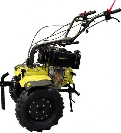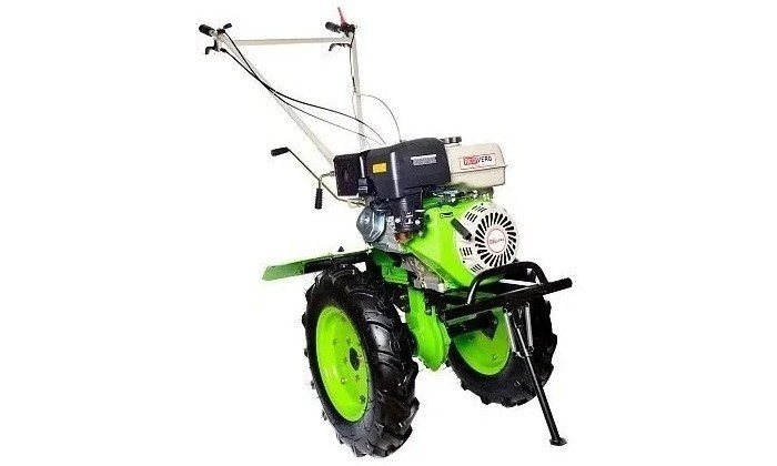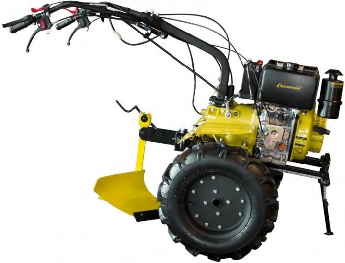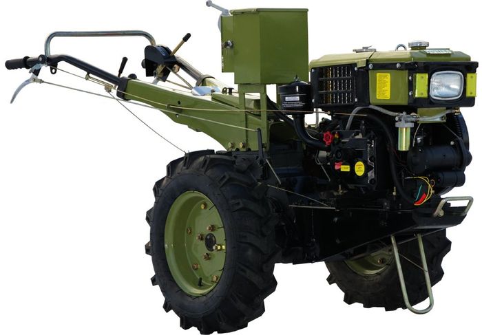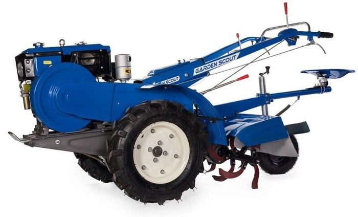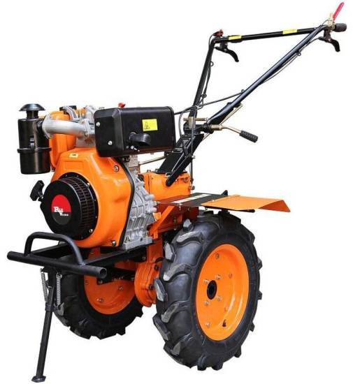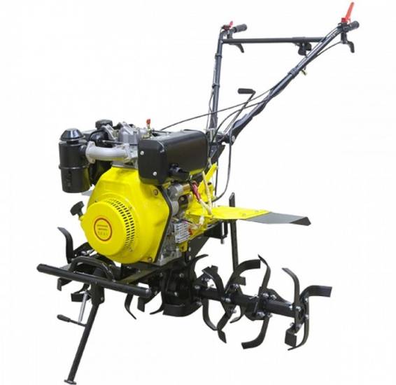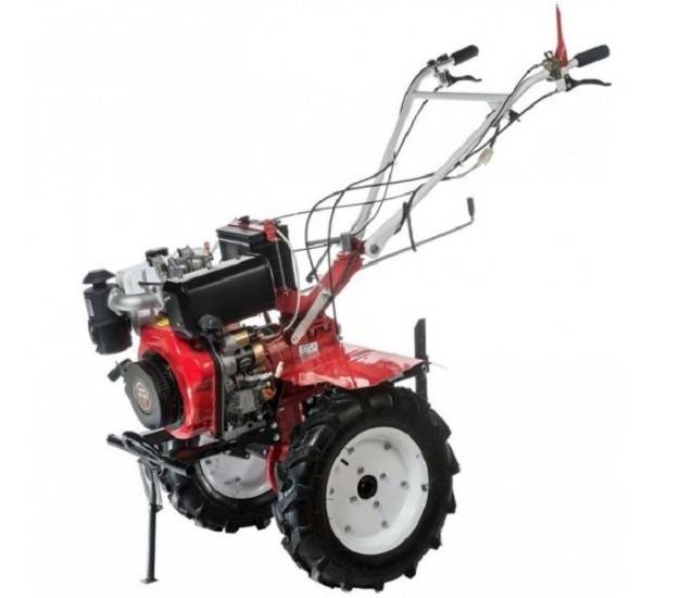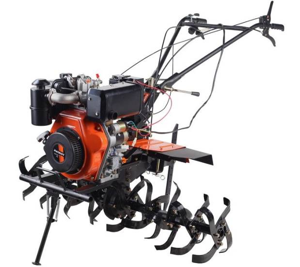 Мощный и тяжёлый мотоблок с дизельным двигателем высокой мощности предназначен для обработки больших земельных участков. Устройство оснащено как электрическим, так и ручным стартером. В конструкции предусмотрен вал отбора мощности, который позволяет подключать различные устройства, такие как снегоуборщики, роторные косилки и мотопомпы для перекачки воды. Многодисковое сцепление без ремней обеспечивает эффективную передачу крутящего момента. Модель также имеет механическую коробку передач с тремя ступенями.
