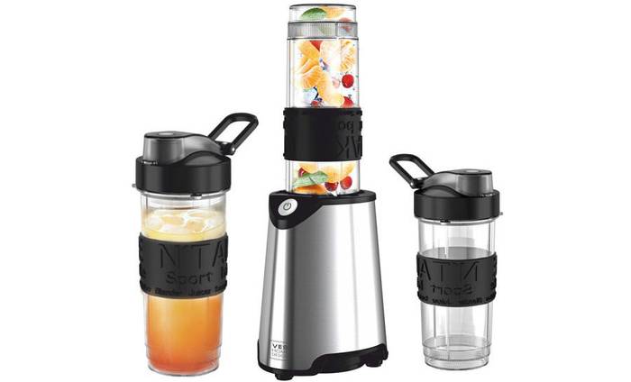 Еще один доступный стационарный блендер. У него предусмотрена одна скорость работы. Максимальная мощность составляет 350 Вт. В комплект входят две дорожные бутылки. Корпус устройства изготовлен из прочного пластика. Максимальная скорость вращения достигает 24000 об./мин. Ножи можно снять, что упрощает их очистку после использования.