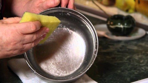 - С помощью мягкой губки аккуратно протереть поверхность кастрюли.