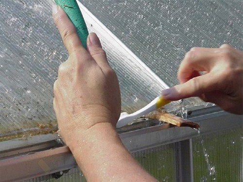 Поверхности каркаса и поликарбоната с обеих сторон очищаются с помощью насыщенного раствора хозяйственного мыла. Для этого 1/3 куска мыла натирается на терке и растворяется в ведре теплой воды.