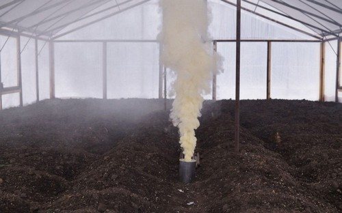 Полученной смесью обрабатывают поверхность теплицы и грунт. Помещение следует оставить закрытым на 2 дня после обработки, а затем открыть для проветривания на 2-3 дня.