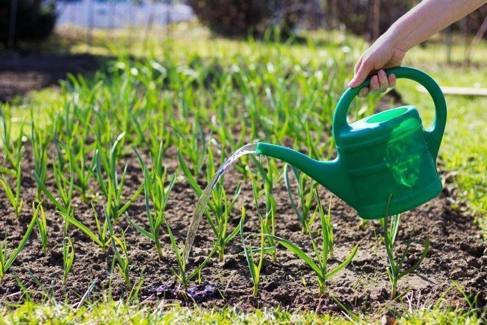 Чеснок способен выдерживать нехватку влаги, однако в этом случае урожай будет незначительным, а зубчики окажутся мелкими и сухими. С приходом весны крайне важно обеспечить растению достаточное количество воды. Это способствует правильному формированию головки. В условиях жаркой и засушливой погоды чеснок рекомендуется поливать раз в 5–6 дней.