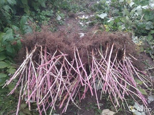 Здоровые корни должны быть светлыми и упругими, без признаков пересыхания. Побеги должны быть тонкими, что указывает на их молодость, и не превышать длину 0,7 метра. Для саженца достаточно наличия 1–3 стеблей. Новая поросль появится весной после укоренения. У купленного кустика побеги должны быть голыми.