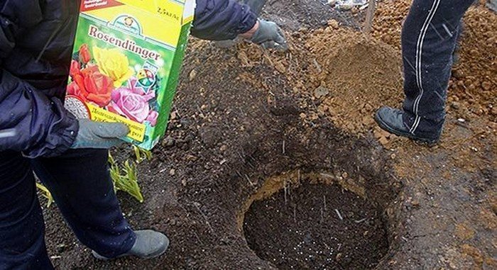На дно посадочной ямы обязательно нужно уложить дренажный слой из керамзита, битого кирпича или щебня. Это поможет избежать накопления избыточной влаги в корневой зоне. Не стоит добавлять удобрения непосредственно перед посадкой, так как это может привести к ожогам корней розы. Минеральные удобрения, компост или перегной следует смешать с почвой и внести в яму за две недели до высадки саженца.