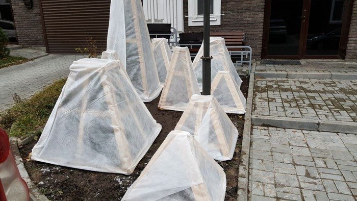 Для укрытия растения можно использовать картонные коробки, перевернутые ведра или деревянные ящики подходящего размера. Также возможно создать каркас из дуг и накрыть его специальным укрывным материалом. Внутри укрытия желательно разместить рыхлый слой из опавших листьев. Альтернативный способ – мульчирование розы сухим торфом с последующим укрытием лапником.