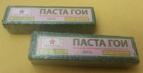 Состав и разновидности: Паста ГОИ состоит из оксида хрома и других абразивных веществ, которые могут варьироваться в зависимости от назначения. Существует несколько градаций пасты, от грубой до очень тонкой, что позволяет использовать её для различных задач — от удаления царапин до достижения зеркального блеска.