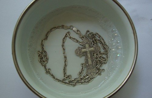 Первым делом нужно вскипятить воду, добавить в нее соду (50 гр/1 л воды). После закипания следует залить раствором потемневшее украшение. Из-за химической реакции сульфида серебра с содой и алюминием чернота пропадет через пару минут. После этого украшение останется только вытереть насухо.