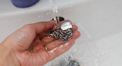 Существует и совершенно безопасный метод очистки, хотя он требует больше времени. Вам понадобятся две чайные ложки мыльного раствора, чайная ложка спирта, лимонного сока и полстакана воды. Все ингредиенты тщательно перемешиваются, после чего цепочку погружают в раствор на двенадцать часов. Затем просто промывают.