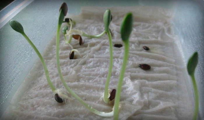 Прессованную вату следует увлажнить раствором-стимулятором на основе «Эпина» (1 капля препарата на 1,7 литра воды). Сверху ватные диски накрывают бумагой, чтобы образовавшиеся корешки не прилипли к подложке. Контейнер размещают на светлом месте под прозрачной крышкой. Когда появятся ростки, семена аккуратно отделяют от бумаги и пересаживают в небольшие горшки.