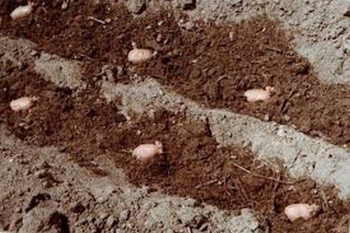 Клубни помещают на дно лунок или борозд глубиной 15-20 см, предварительно добавив органические удобрения и древесную золу. Свежий навоз использовать не следует, так как он привлекает медведок. Если органических удобрений нет, можно воспользоваться химическими, равномерно распределив их по участку или добавив в лунки в 1,5 раза меньшей дозировкой. После этого почву необходимо заделать граблями.