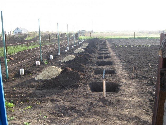 - Среднерослые. Глубина — 70 см, диаметр — 80 см. Расстояние между ямами — 3–4 м, между рядами — 4 м.