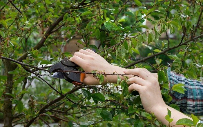 После завершения сбора последних ягод с вишни, настает время для проведения обрезки, которая поможет стимулировать рост. Для формирования кроны лучше выбрать весну или осень, когда сокодвижение в ветвях менее активно.