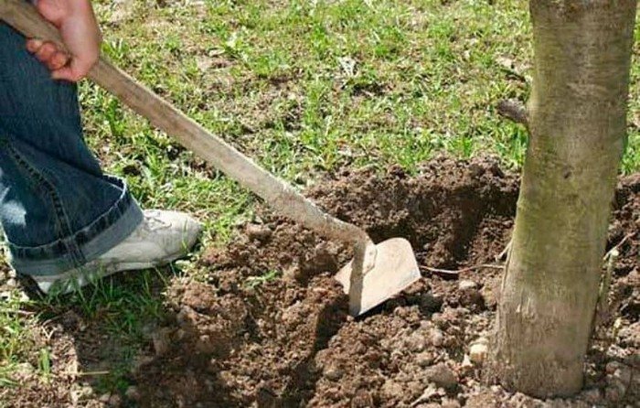 Рыхление следует выполнять осторожно с помощью граблей или культиватора. В процессе работы также стоит удалить корневища сорняков и личинок вредителей из вскопанной земли. После обработки приствольный круг рекомендуется замульчировать. В качестве мульчи можно использовать сено, перепревшие опилки или резаную солому. Разлагаясь, органические материалы обеспечат дереву дополнительное питание и обогатят почву гумусом.