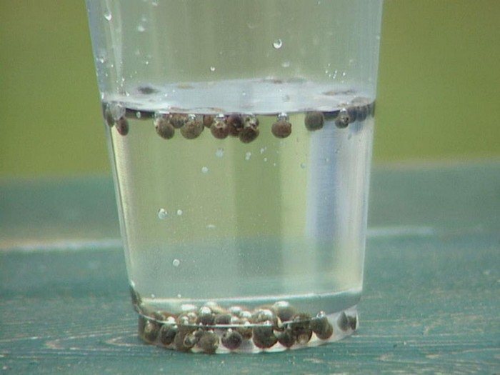 Калибровка — это метод, при котором семена помещаются в стакан с водой, в которую добавляется одна чайная ложка соли с горкой. Необходимо подождать 5-10 минут. В результате качественные семена опустятся на дно, а пустые останутся на поверхности, и их можно будет просто удалить.