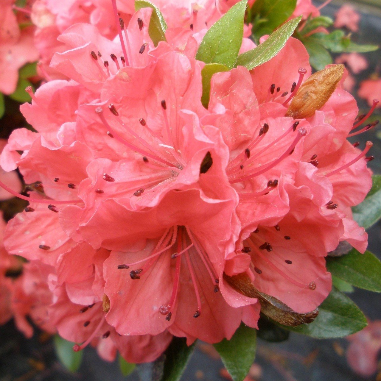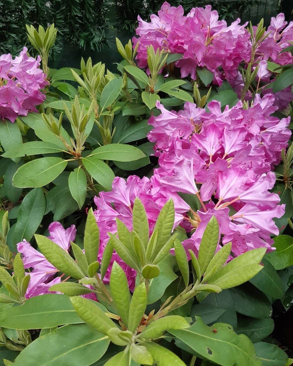 Некоторые виды рододендронов сбрасывают листву раз в два года. Вечнозелёные кустарники выделяются своими плотными листьями, которые прекрасно сочетаются с яркими цветами.