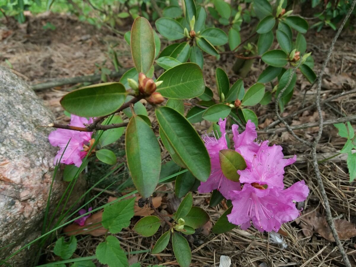 Цветение рододендрона Даурского может длиться до 20 дней. Его крупные цветы имеют форму воронки и окрашены в фиолетово-розовые тона.