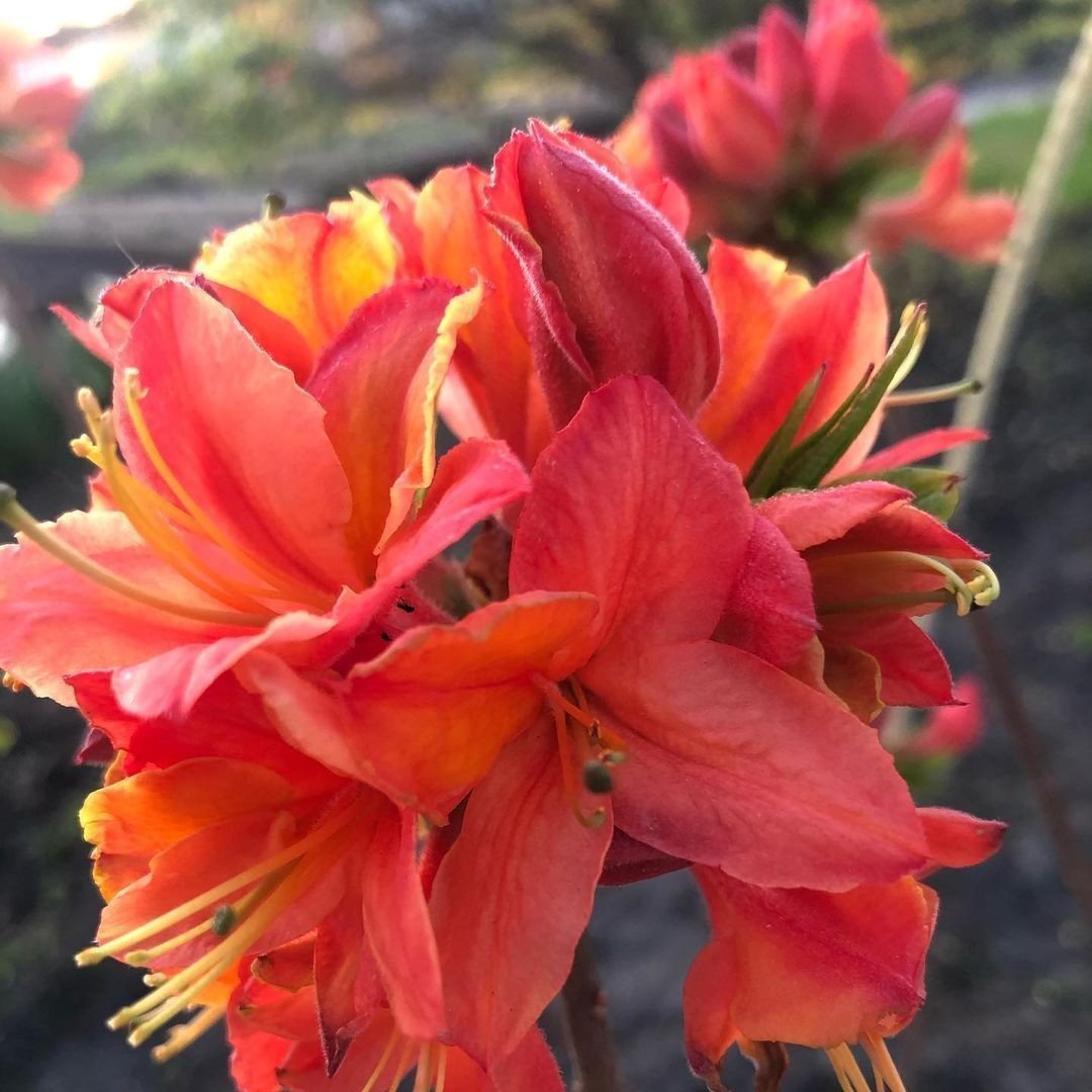 Рододендрон Мандарин Лайтс отличается обильным цветением. Ароматные цветы имеют воронковидную форму и окрашены в красновато-оранжевые тона. Они образуют шарообразные соцветия, состоящие из 7-10 цветков.