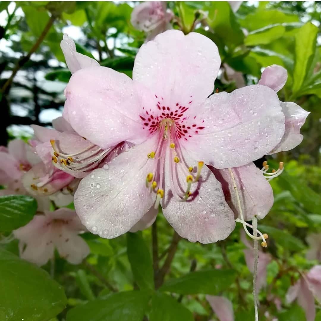 В период с апреля по май рододендрон покрывается светло-розовыми бутонами, которые затем распускаются в белые цветы с коричневыми и бледно-фиолетовыми пятнышками. Соцветия формируются из 7-10 цветков. Эта разновидность рододендрона способна повторно цвести осенью.