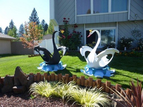Из ненужных автомобильных шин можно создать не только цветник. В вашем саду также прекрасно будут смотреться лебеди, выполненные из этого материала.