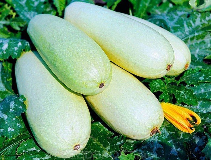 - Кабачки имеют удлиненную, округлую форму, с гладкой поверхностью и легкой ребристостью. Их цвет варьируется от желтоватого до белого. Вес каждого плода составляет 600–900 г, а длина — 22–30 см. Кожура тонкая, но достаточно прочная.