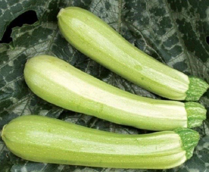 - Кабачки имеют молочно-зеленый цвет с крапинками, удлиненной и ребристой формой. Вес каждого плода составляет 500–600 г, а длина достигает 20 см.