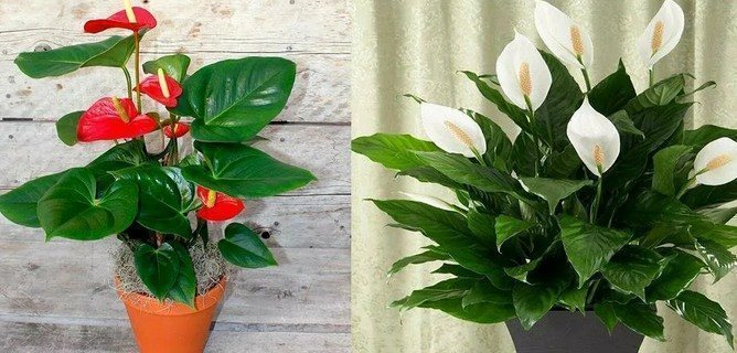 Спатифиллум радует глаз своими элегантными белыми цветами, а антуриум добавляет яркие красные акценты.
