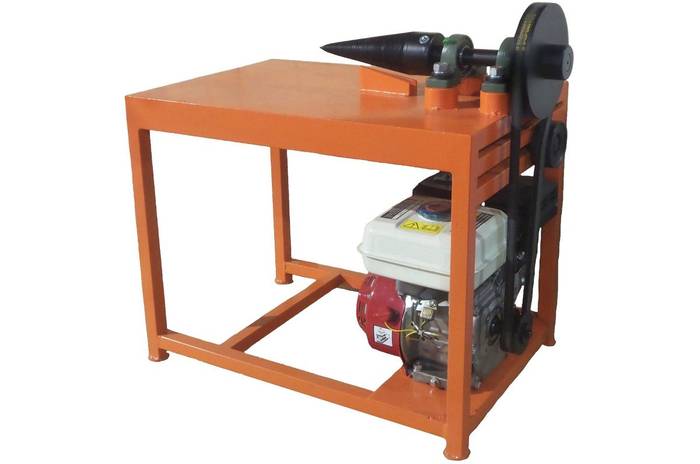 Настольный дровокол с весом 40 кг устанавливается на надежное металлическое или бетонное основание. Колеса, расположенные на корпусе, предназначены для удобного перемещения на небольшие расстояния по ровным поверхностям. Двигатель мощностью 1,5 кВт обеспечивает толкающее усилие в 4 тонны, при этом в гидравлической системе создается давление масла в 14 Мпа. Для работы устройства требуется 2,4 литра масла.