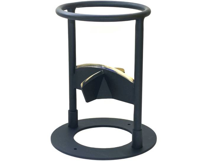 В центре работы дровокола находится крестообразный нож, который позволяет разрубать полено на четыре части всего одним ударом. Толщина лезвий составляет 5 мм. Два конца четырехгранного ножа надежно приварены к стойкам высотой 350 мм. Эти стойки изготовлены из труб диаметром 20 мм и прочно установлены в гнезда нижнего кольца. Для установки дровокола требуется лишь небольшая площадка диаметром 280 мм.