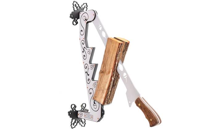 Нож соединяется со стойками-трубками с помощью аккуратных сварочных швов. С одной стороны стойка продолжается и завершается полукруглой опорой-спинкой. Снижение высоты ножа и наличие спинки не позволяют полену упасть. Открытое лезвие не накладывает строгих ограничений на размеры бревна. Длина заготовки может достигать 45 см, а ширина — 40 см.