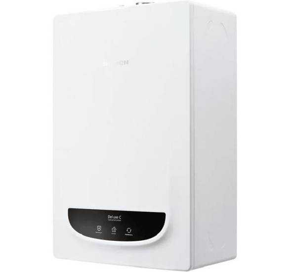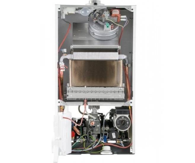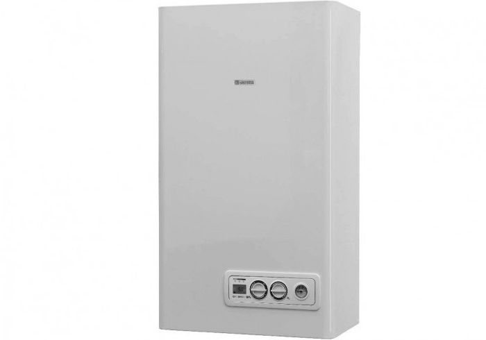 Это самый доступный котёл в нашем списке. Тем не менее, он предлагает впечатляющий набор функций: автодиагностика с отображением результатов проверки, автоматический запуск, регулировка пламени и полный спектр защитных систем (от замерзания, блокировки насоса, перегрева). Модель является двухконтурной. Внутри установлен надежный битермический теплообменник, который отличается длительным сроком службы. Первичный теплообменник выполнен из меди. Тепловая мощность устройства варьируется от 7 до 24 кВт.