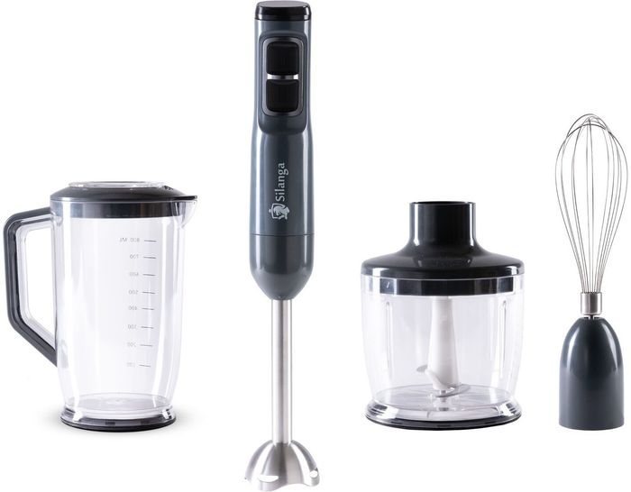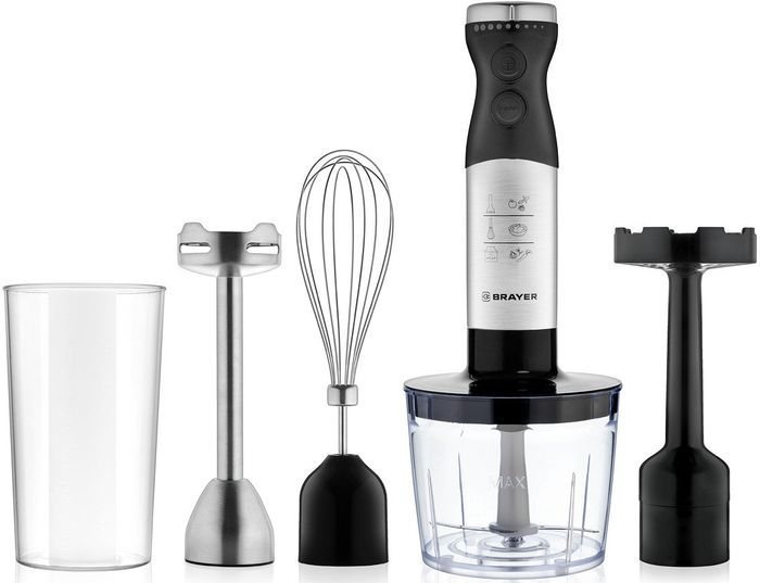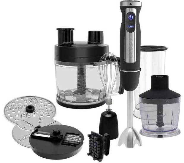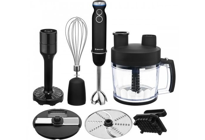 Этот многофункциональный блендер способен выполнять разнообразные задачи на кухне: он измельчает, взбивает, смешивает и готовит картофельное пюре. Дизайн устройства выглядит современно: черный пластиковый корпус гармонично сочетается с металлическими элементами. Регулировка скоростей расположена на конце корпуса, что делает ее удобной в использовании и придает интересный вид. По своим характеристикам блендер практически сравним с кухонным комбайном. Его мощность составляет 800 Вт, имеется турборежим, объем мельнички — 500 мл, а мерной чаши — 700 мл. Специальная насадка позволяет готовить картофельное пюре, не превращая его в клейкую массу, а создавая нежную и вкусную консистенцию.