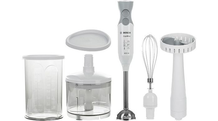 Блендер марки Бош комплектуется мельничкой, мерным стаканом, венчиком, погружной частью и насадкой для приготовления картофельного пюре. Устройство обладает мощностью 600 Вт, однако его высокая эффективность обеспечивает результаты, сопоставимые с более мощными моделями других производителей. Блендер предлагает 12 скоростей с плавной регулировкой и режим «турбо». Объем мерного стакана составляет 0,7 литра. Производитель уделил внимание удобству использования: зауженная часть корпуса имеет специальное покрытие, что обеспечивает комфортный захват, а кнопки управления расположены так, что их легко нажимать, не совершая лишних движений. На основании чаш находятся резиновые ножки, которые предотвращают скольжение и уменьшают уровень шума и вибрации.
