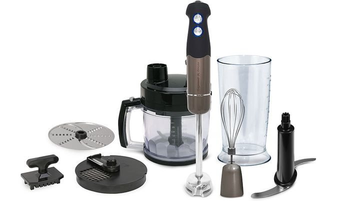 Этот универсальный блендер с обширным набором насадок способен заменить все остальные устройства для измельчения, смешивания и взбивания. В комплект входят металлическая погружная часть, насадка для шинковки, большая мельничка объемом 1,5 литра, венчик и мерный стакан. Ножи изготовлены из запатентованной стали STEEL PRO. На крышке мельнички предусмотрен специальный клапан, который позволяет непрерывно загружать продукты. Объем в 1,5 литра позволяет одновременно загружать до 0,5 кг ингредиентов. Для того чтобы переработать 0,5 кг мяса в фарш, блендеру потребуется всего одна минута. Производитель уделил особое внимание удобству эксплуатации: корпус удобно лежит в руке, на мельничке имеется прокладка, предотвращающая скольжение по поверхности стола, а съемные детали легко моются.
