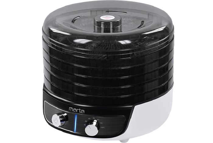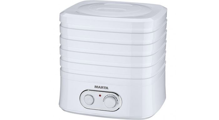 Восьмиуровневая конструкция включает в себя 8 стандартных лотков для хранения фруктов и овощей, а также 3 съемных поддона, которые идеально подходят для приготовления теста, йогуртов и других кисломолочных продуктов. В комплект также входят специальные лотки для сушки трав, орехов, мяса и рыбы. Сушилка Марта оснащена поворотным регулятором, позволяющим устанавливать температуру в диапазоне от 35 до 70 градусов.