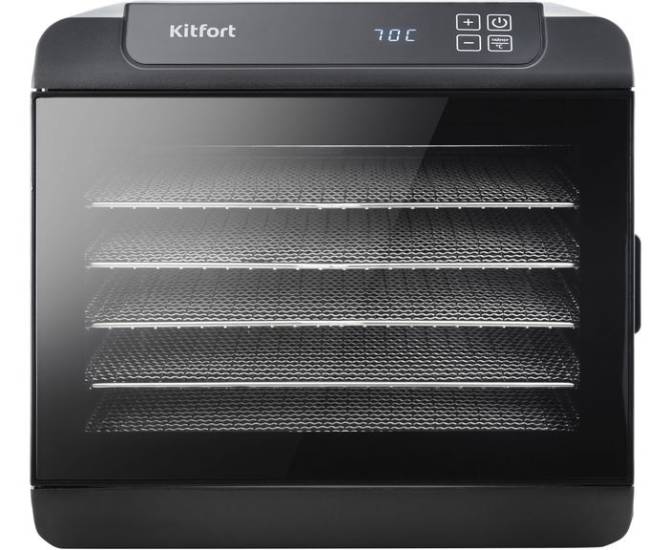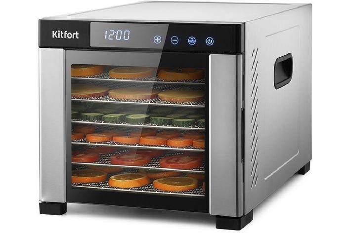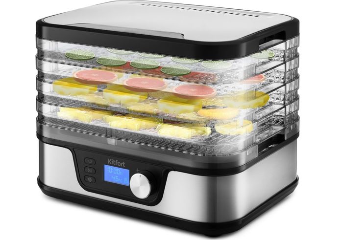 Доступное сушильное устройство от популярного бренда Kitfort, предназначенное для использования в домашних условиях. Многие покупатели выбирают эту сушилку из-за ее разумной цены, электронного управления и функции таймера, который позволяет сушить продукты до 72 часов. Удобство в эксплуатации обеспечивается дисплеем на передней панели, который показывает оставшееся время до завершения процесса. Мембранные кнопки позволяют легко выбирать программы, устанавливать режимы и задавать температуру для фруктов, мяса и овощных заготовок.