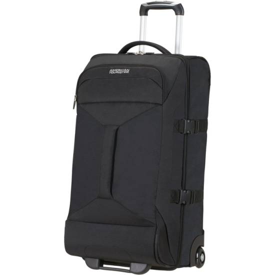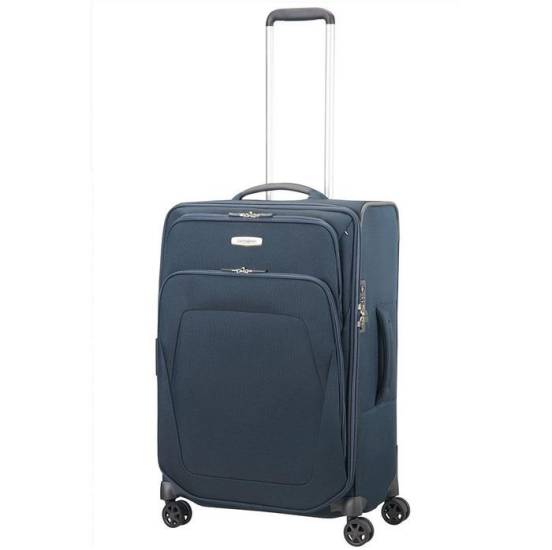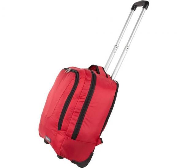 Верхняя часть чемодана изготовлена из прочного полиэстера. Модель оборудована удобной телескопической ручкой из алюминия, а также четырьмя маневренными колесами и несколькими внутренними карманами.