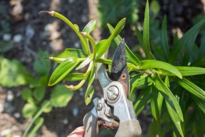 После обрезки цветы на клумбе сохранят свою декоративность и продолжат радовать глаз до наступления холодов. Как только листья лилий начнут желтеть и сохнуть, их следует срезать, оставляя пеньки высотой 7–8 см. Некоторые садоводы предпочитают просто выкручивать стебли у основания. Пеньки необходимы для того, чтобы не потерять ориентир на месте посадки лилий, особенно если на участке много многолетников.
