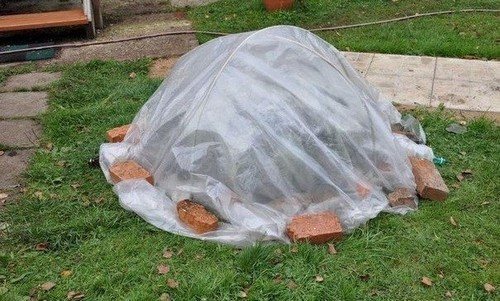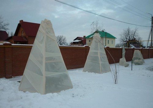 Кусты можно укрывать агроволокном или тканью, создавая при этом каркас из кольев или сетки. Внутреннее пространство заполняется сухими листьями, после чего его накрывают рубероидом или полиэтиленом. При этом каркас должен находиться выше уровня куста.