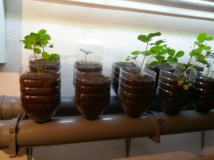 Для этого возьмите обычную пластиковую бутылку и отрежьте верхнюю часть, оставив открытым горлышко, через которое корни земляники будут получать питательные вещества. В пластиковый контейнер поместите твердый субстрат и аккуратно высадите рассаду. В трубе ПВХ сделайте отверстия диаметром 2–3 см, в зависимости от размера горлышка бутылки. Отверстия следует сверлить на расстоянии 10–15 см друг от друга и вставить в них «горшки» с растениями. Один конец трубы закройте заглушкой, а к другому прикрепите уголок, который будет служить для подачи воды и удобрений.