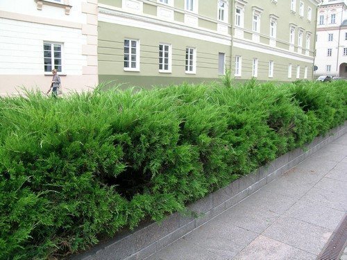 Очень выигрышно смотрятся вечнозеленые изгороди из туи западной сортов «Смарагд» и «Даника», можжевельника китайского «Стрикта» и ели европейской «Нидиформис». Для создания невысоких цветущих изгородей можно высадить спирею японскую, спирею серую, спирею березолистную, шиповник морщинистый, лапчатку кустарниковую.